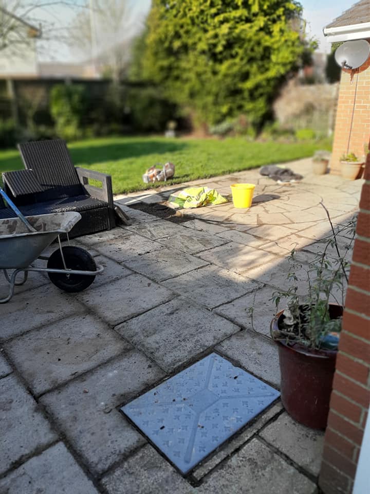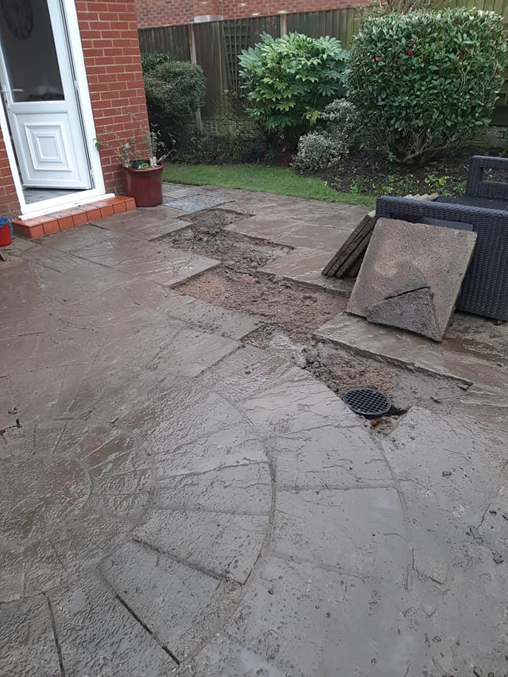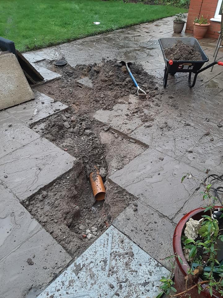 Laying a drain under a new patio due to flooding.