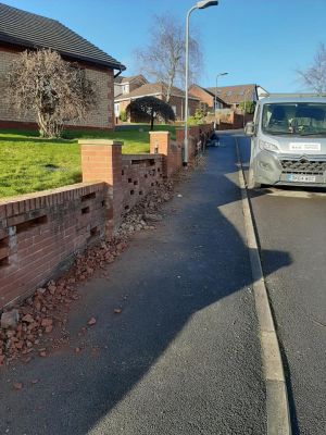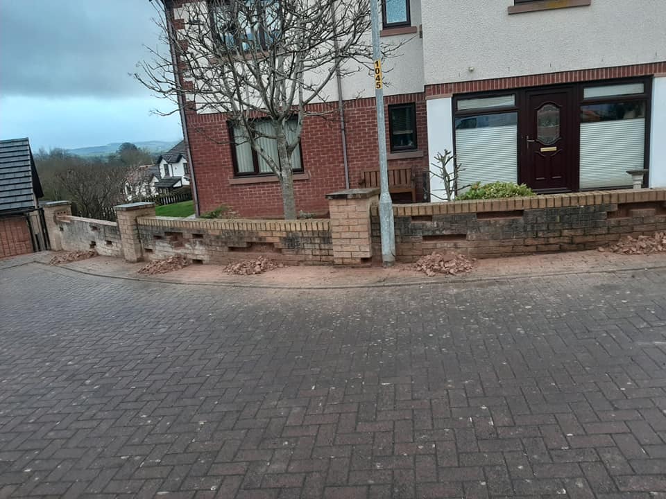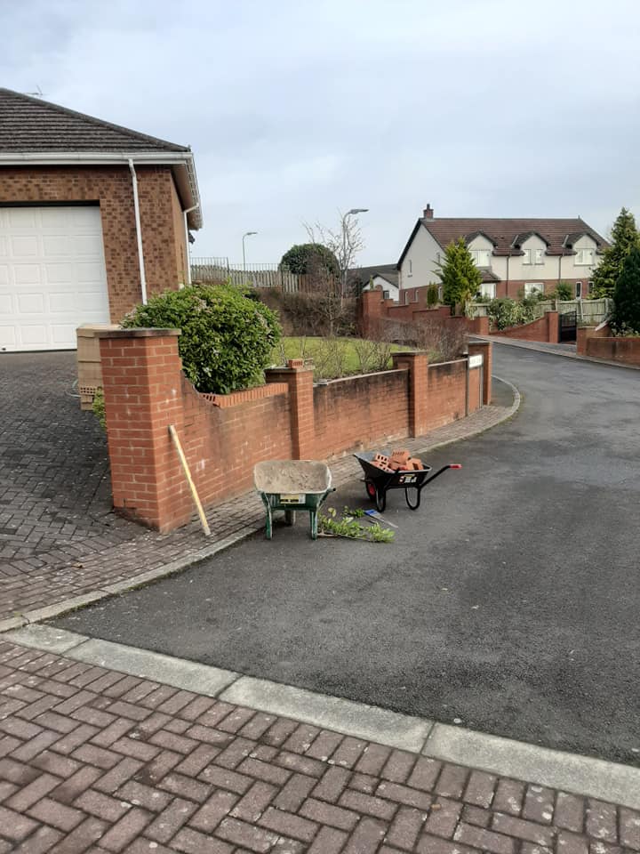 Cutting out broken bricks from a garden wall and replacing with new ones 857 individual bricks replaced.